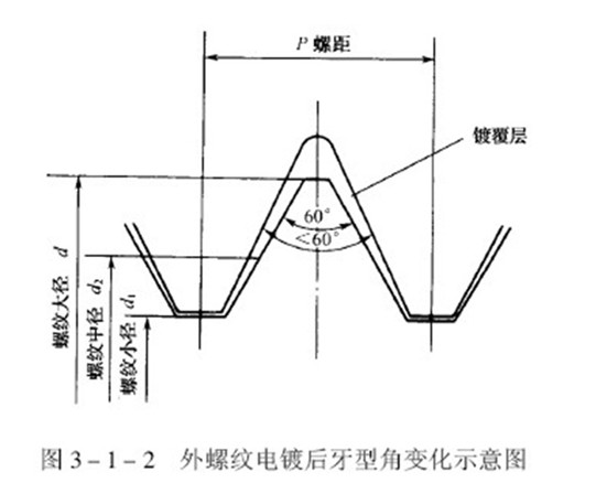 帶有普通螺紋的零件和緊固件,常遇到鍍覆后發(fā)生配合障礙的問題。當(dāng)螺紋進(jìn)行電鍍時(shí),螺紋的牙尖部位和谷底部位的鍍層厚度是不一樣的,牙尖部位的鍍層厚度將明顯的大于谷底部位,隨著鍍層厚度的增加,它們之間的差異會越來越大,因此,螺紋的牙型角度變小,如圖所示。隨著螺紋直徑和螺距的不同,雖然牙尖和谷底部位鍍層厚度差異的比值也不同,但是隨著鍍層厚度增加,牙型角角度變小的傾向是始終如此的。螺紋直徑和螺距大一些,精度低一些,螺紋鍍后配合障礙就少一些,反之則多。實(shí)踐證明,螺紋電鍍后出現(xiàn)配合障礙的主要原因是牙型角鍍后的變形,其次才是鍍層厚度因素。