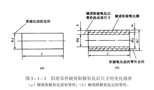 鋁及鋁合金表面上的硬質(zhì)陽極氧化膜,具有較高的硬度和優(yōu)良的耐磨性,是改善鋁質(zhì)零件表面耐磨性的常用手段,為了提高零件的使用壽命,產(chǎn)品設(shè)計(jì)通常要求硬質(zhì)陽極氧化膜層具有較大的厚度,因此,鋁質(zhì)零件硬質(zhì)陽極化以后,零件的最終尺寸變化就比較大,通常遵循這樣的規(guī)律,就是零件最終尺寸的增大值,大體上等于膜層厚度的1/2,如圖所示。該數(shù)值被廣泛用于估算鋁質(zhì)零件硬質(zhì)陽極化以后尺寸的變化規(guī)律。