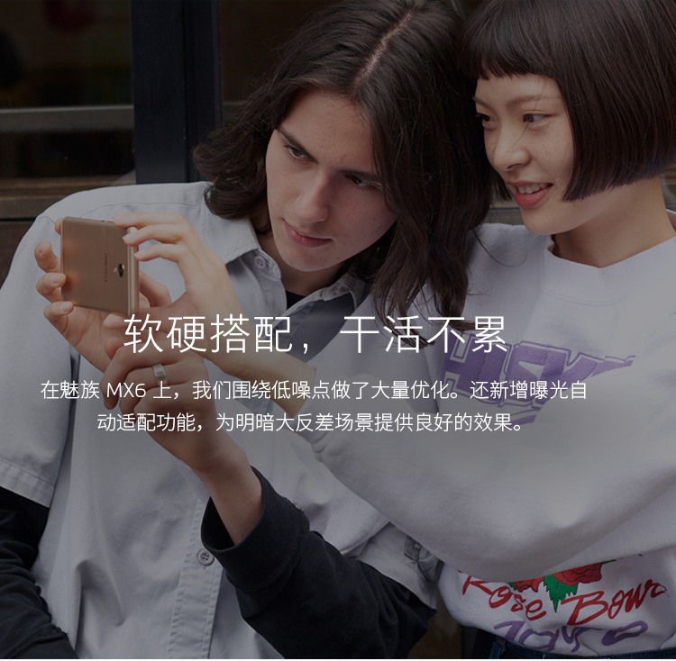 拍照方面,魅族MX6前置500萬像素攝像頭,為OV5695傳感器,光圈f/2.0,支持魅族自家FotoNatino2.0智能美顏和Face AE面部曝光增強;其后置1200萬像素攝像頭,為索尼Exmor RS IMX386傳感器,單個像素為1.25微米,采用藍玻璃濾光片,6片式鏡頭設計,光圈f/2.0,支持高密度相位檢測。